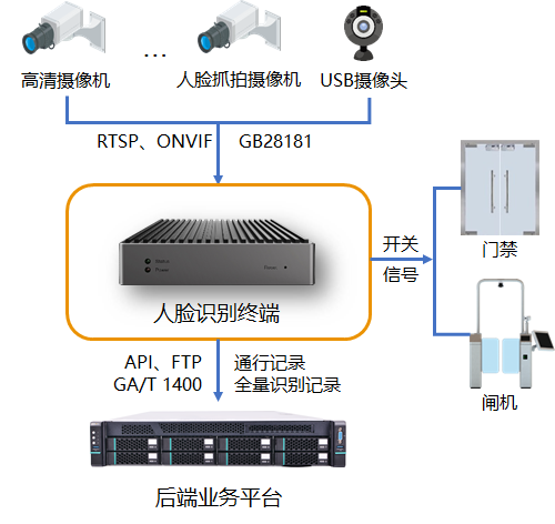 采用人臉識別和訪客機的方式,通過門口攝像機采集的人臉信息,跟系統(tǒng)中的人臉庫做比對,判斷來訪者是否有進出權(quán)限,并結(jié)合傳統(tǒng)的門禁識別方式,控制門鎖的開關(guān),從而方便人員通行,提高服務(wù)質(zhì)量。業(yè)務(wù)需要的情況下,可以在人臉識別的同時,記錄考勤信息,生成考勤報表。