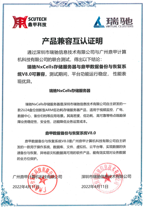 近日,鼎甲科技與瑞馳完成產(chǎn)品兼容互認(rèn)證。本次兼容性互認(rèn)證經(jīng)瑞馳與鼎甲科技雙方聯(lián)合測試得出:瑞馳NxCells存儲服務(wù)器與鼎甲數(shù)據(jù)備份與恢復(fù)系統(tǒng)V8.0可兼容,測試期間,平臺功能運行穩(wěn)定,性能表現(xiàn)優(yōu)異。