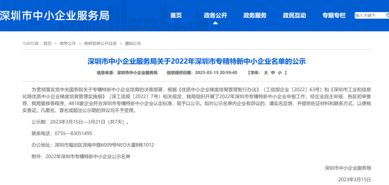 2023年3月15日,深圳市中小企業(yè)服務(wù)局發(fā)布了2022年度“專精特新”企業(yè)名單。經(jīng)企業(yè)自愿申報(bào)、各市中小企業(yè)主管部門推薦、專家評審等程序,深圳市瑞馳信息技術(shù)有限公司憑借自身“極致、創(chuàng)新”的企業(yè)理念,順利通過深圳市2022年度“專精特新”中小企業(yè)審核,榮獲深圳市“專精特新”企業(yè)榮譽(yù)稱號。