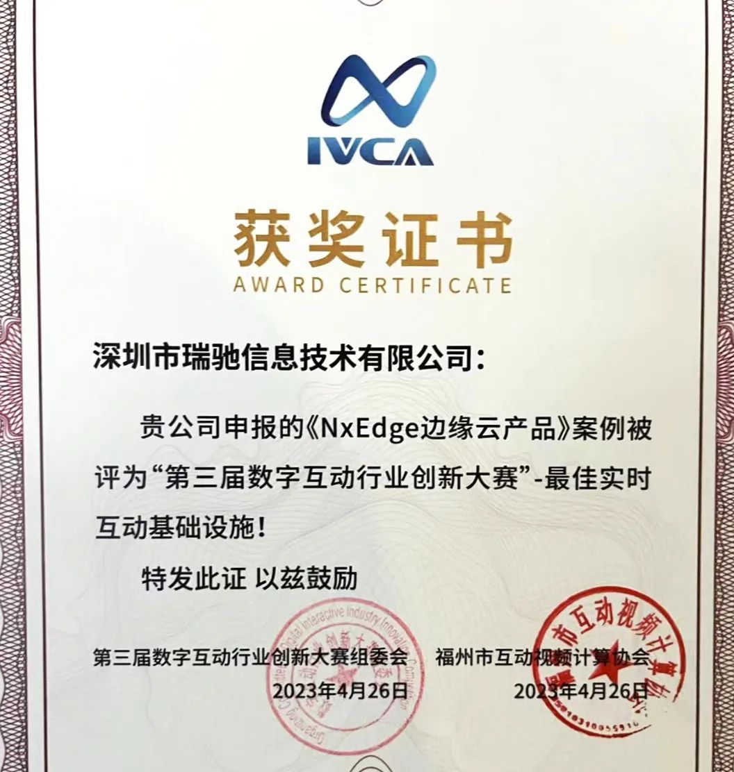 瑞馳榮獲數(shù)字互動行業(yè)創(chuàng)新大賽登云獎 “最佳實時互動基礎設施”獎。